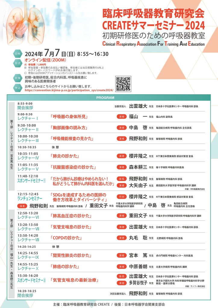 呼吸器コモンディジーズを、教育病院で働く熱い指導医たちから、学んでみませんか? 今回のCREATEサマーセミナーでは、呼吸器の身体所見、胸部画像、呼吸機能検査,抗酸菌感染症,肺炎、喘息、肺高血圧,COPD、間質性肺炎、肺がんなど、基本の確認から最新知識のアップデートまでが可能です!